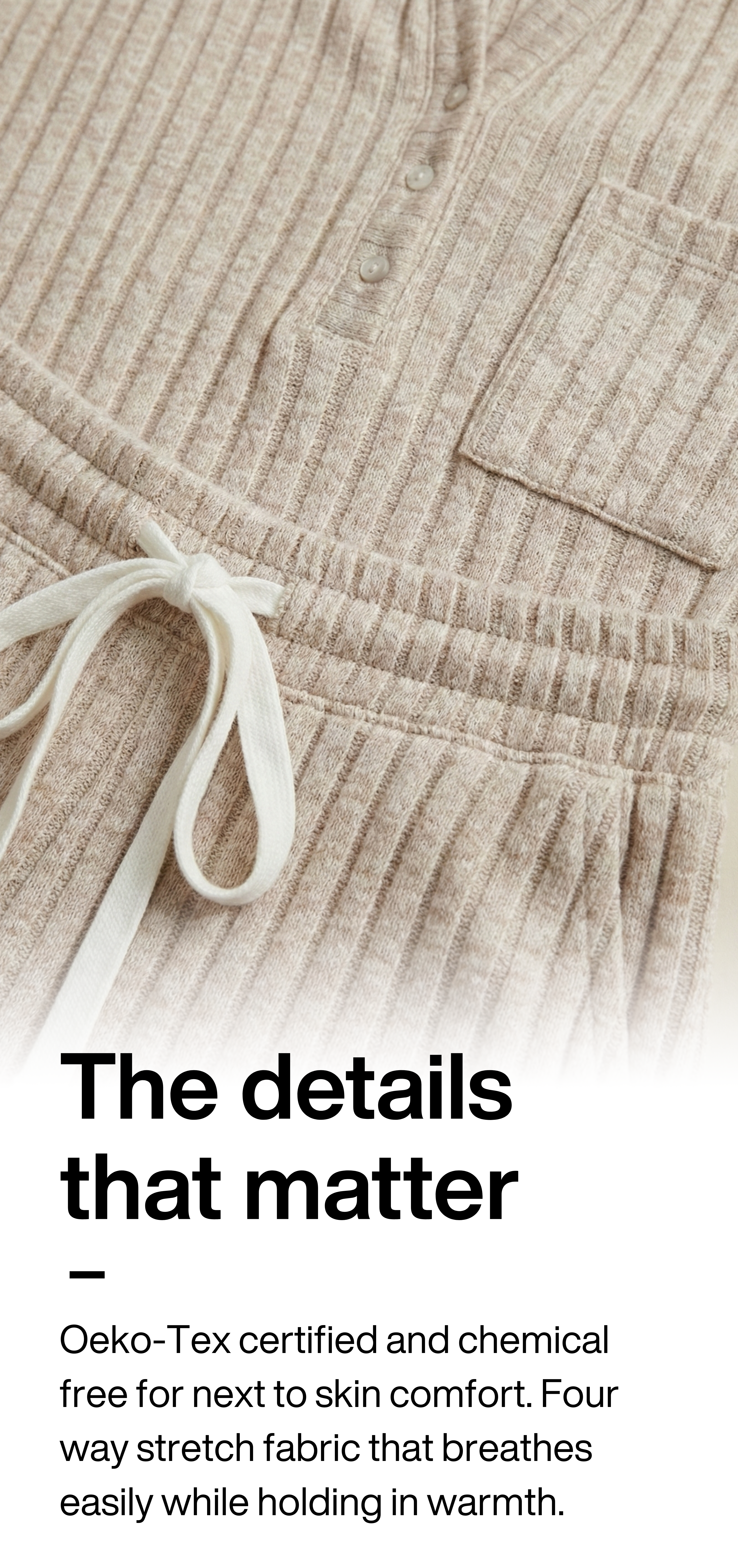 Blended with rayon for softness, spandex for recovery, and OEKO-TEX® certified fibers for a chemical-free, skin-safe finish.