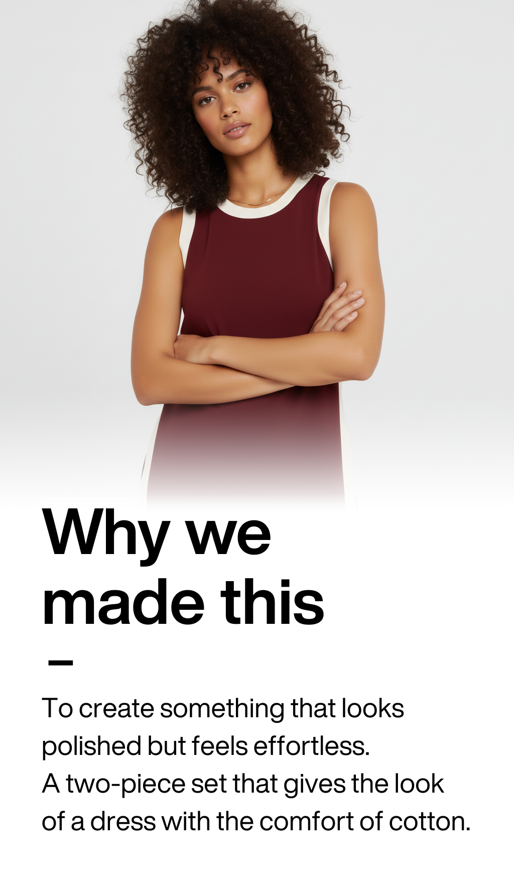 A two-piece set that looks like a dress but feels like freedom. 100% cotton, real pockets, and a flattering fit made for everyday ease — from brunch to the beach.
