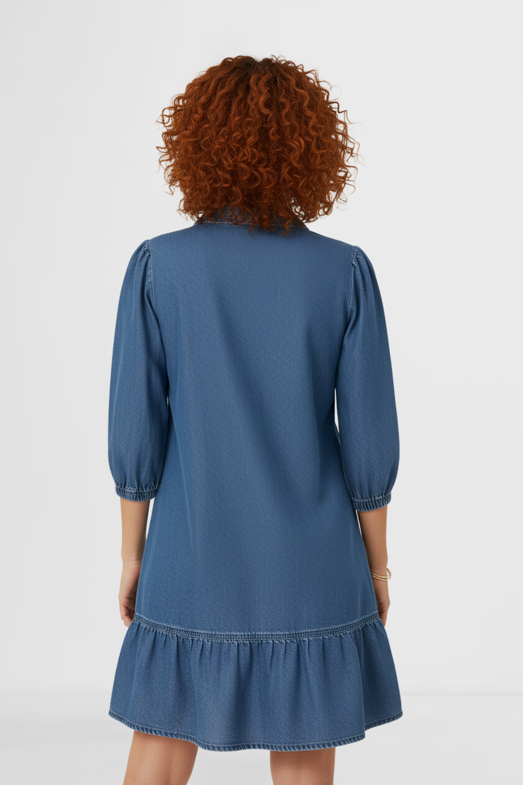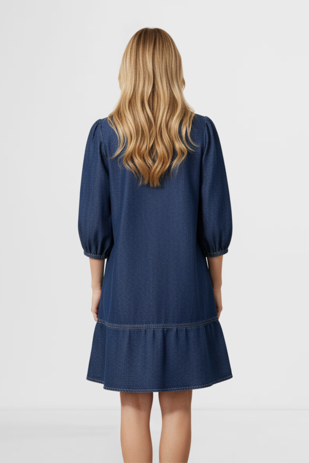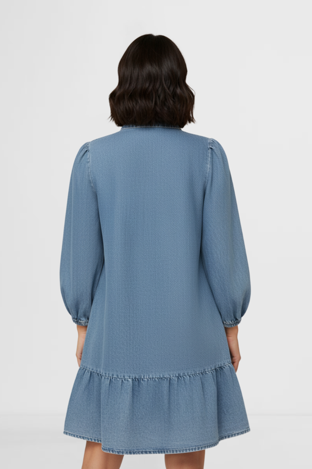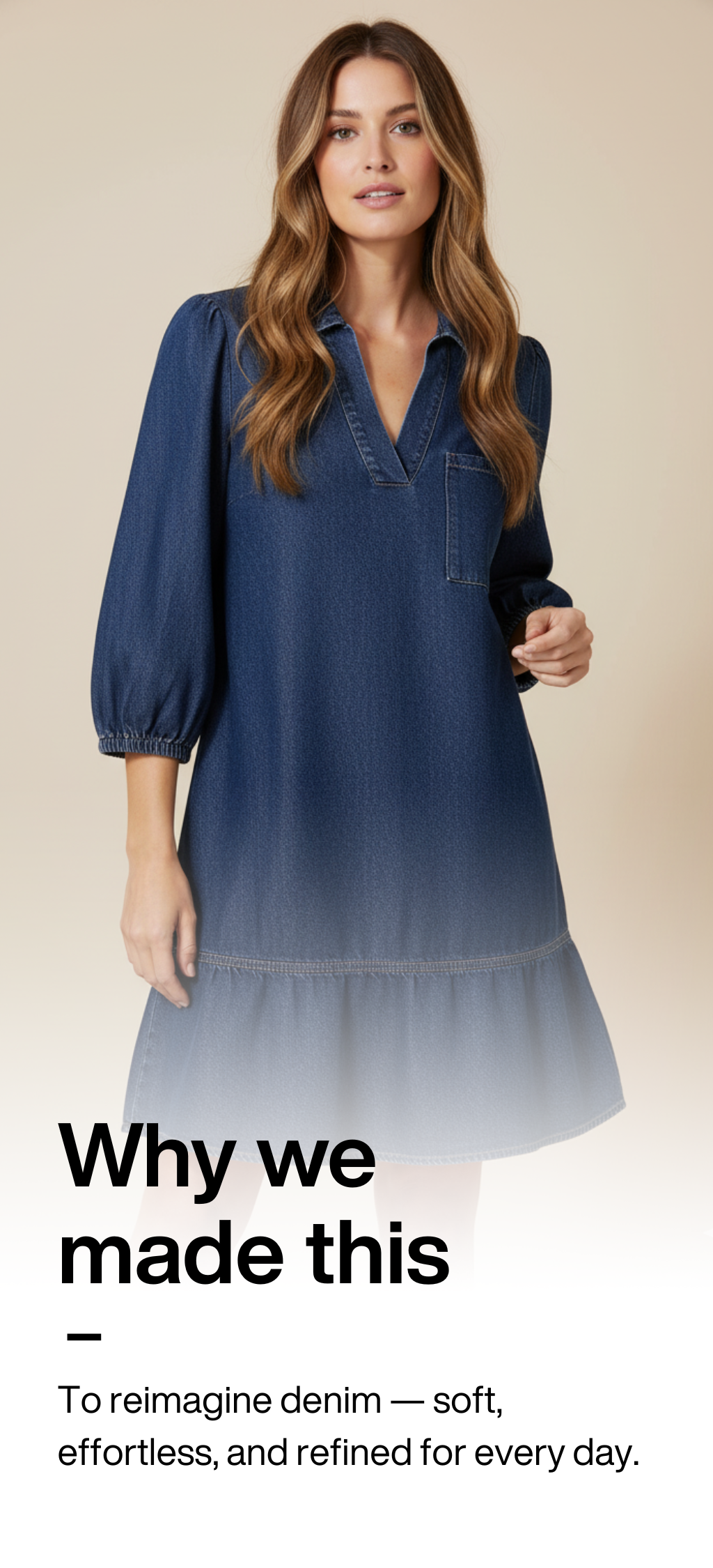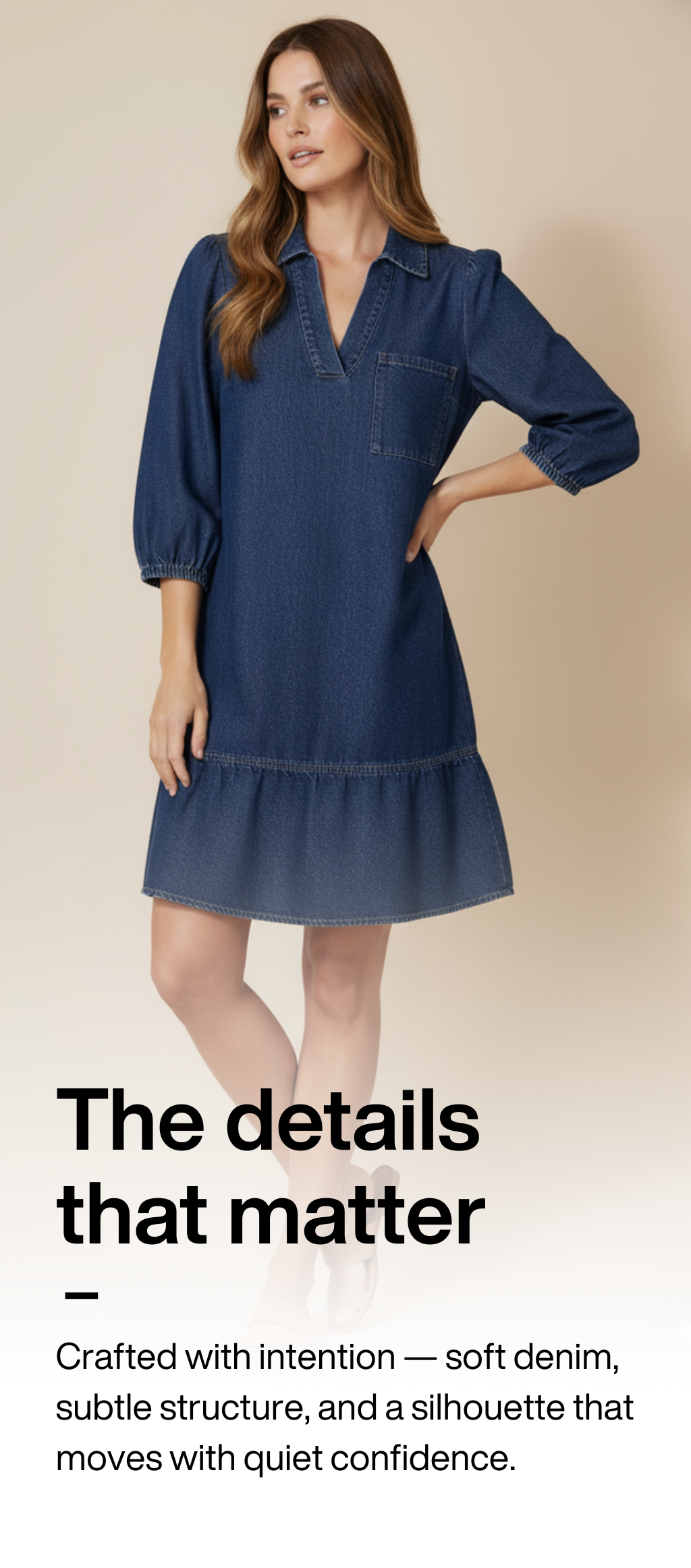 A sculpted V-neck and smocked sleeves meet fluid denim drape — relaxed, refined, and quietly confident.