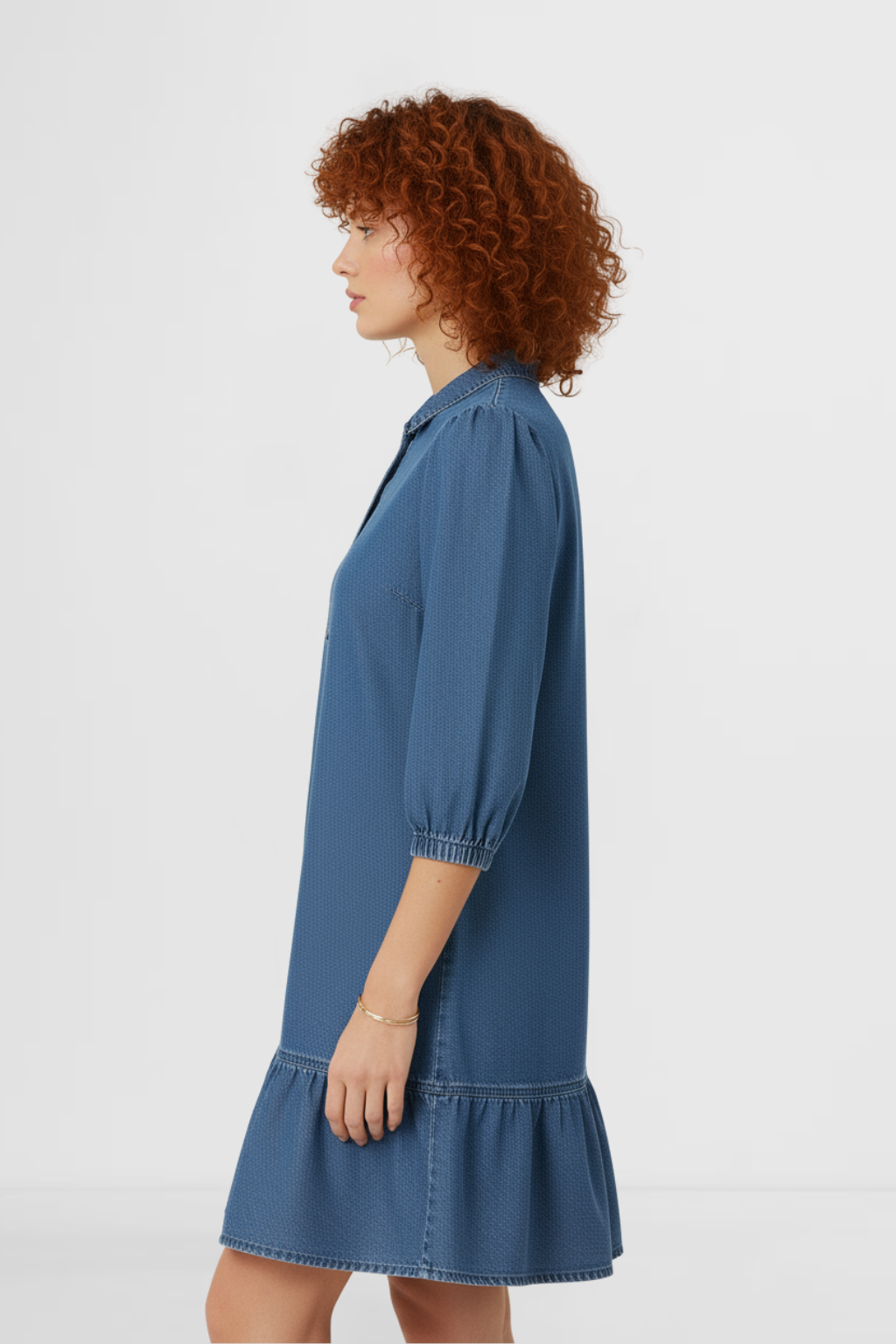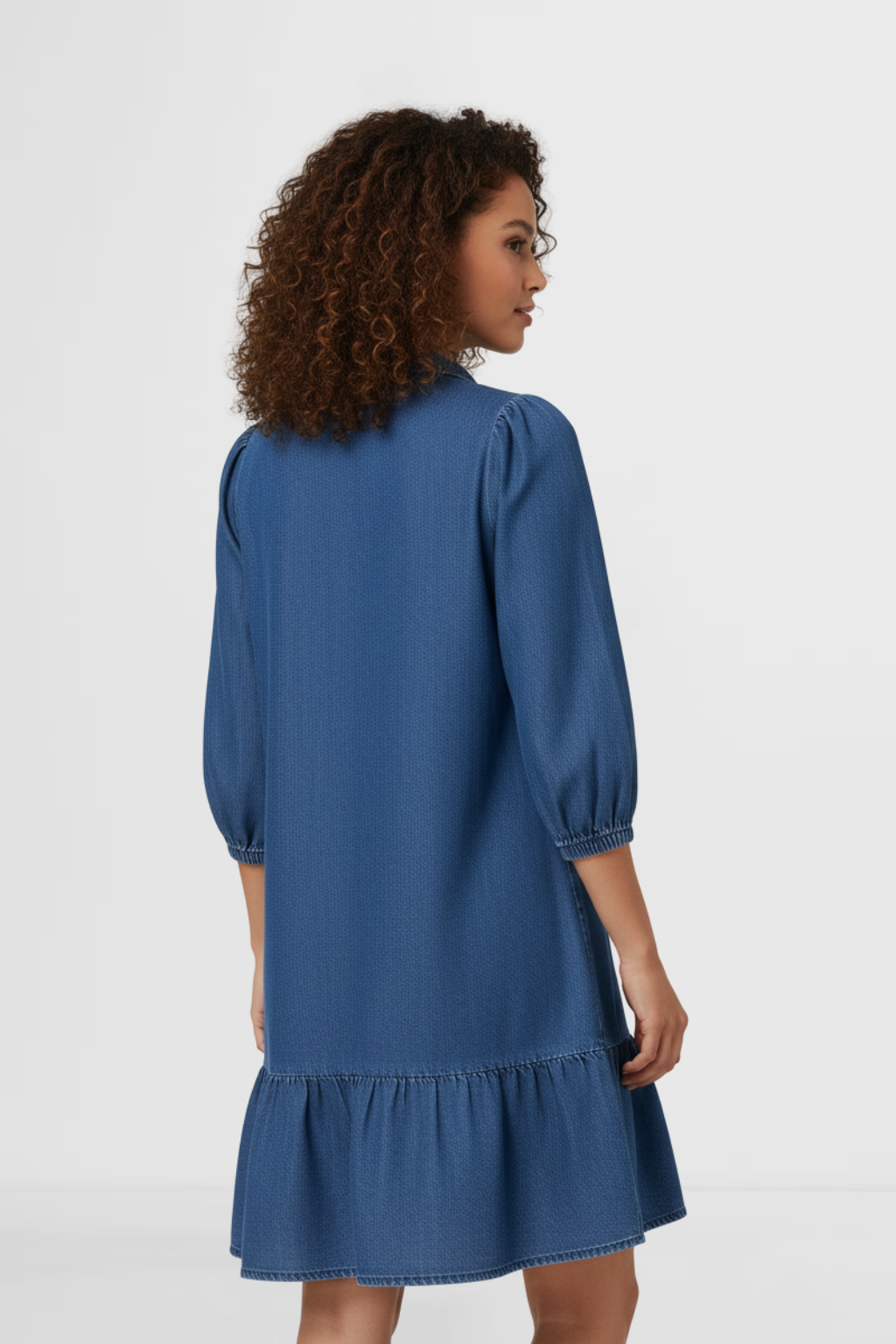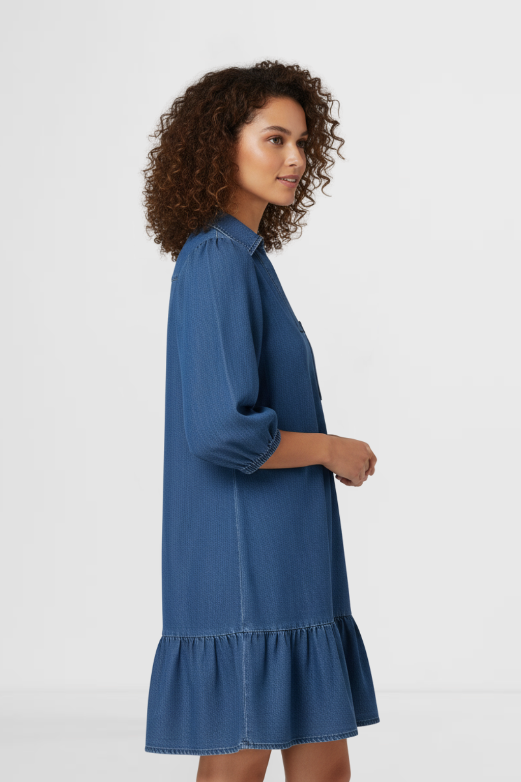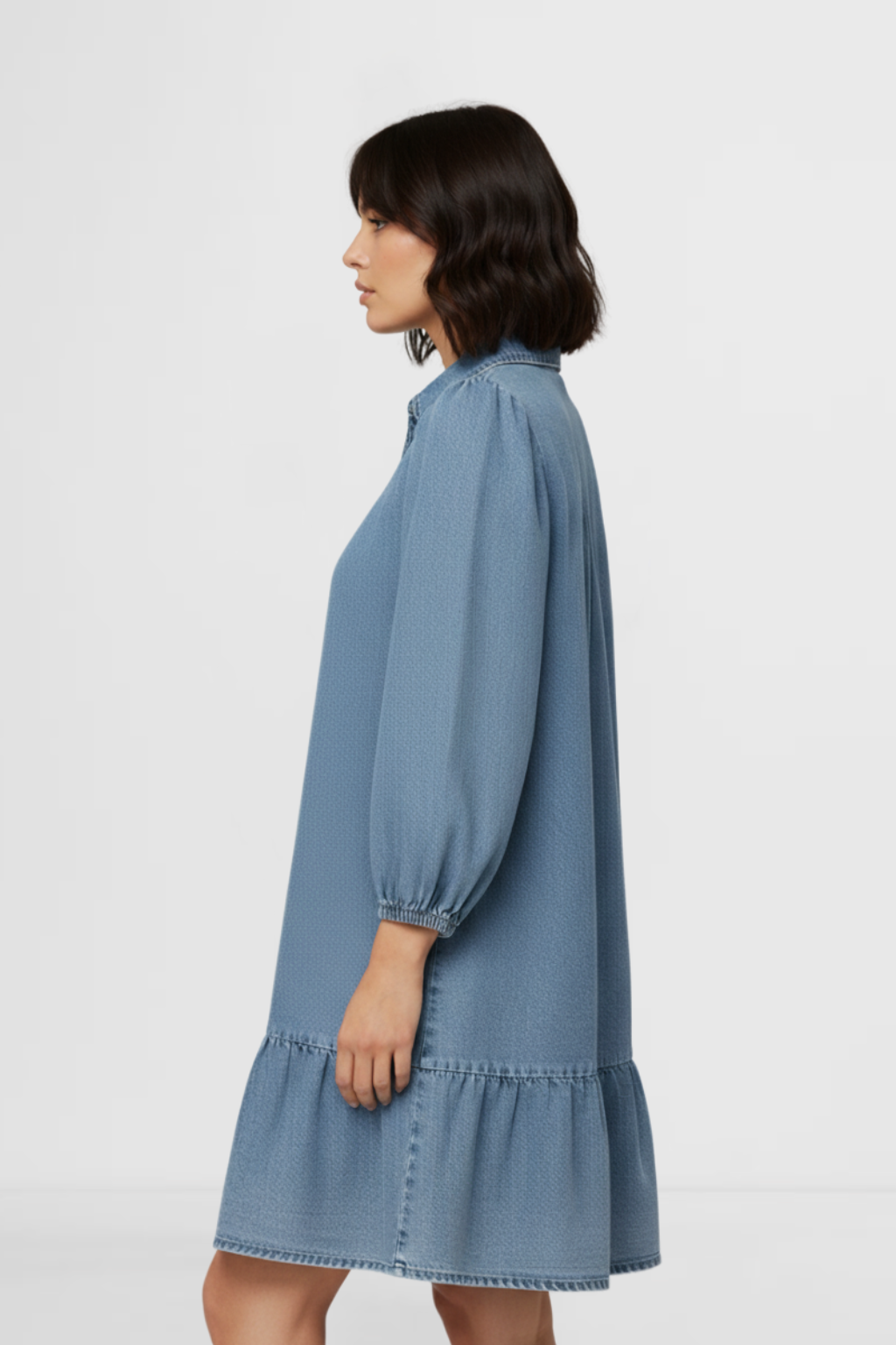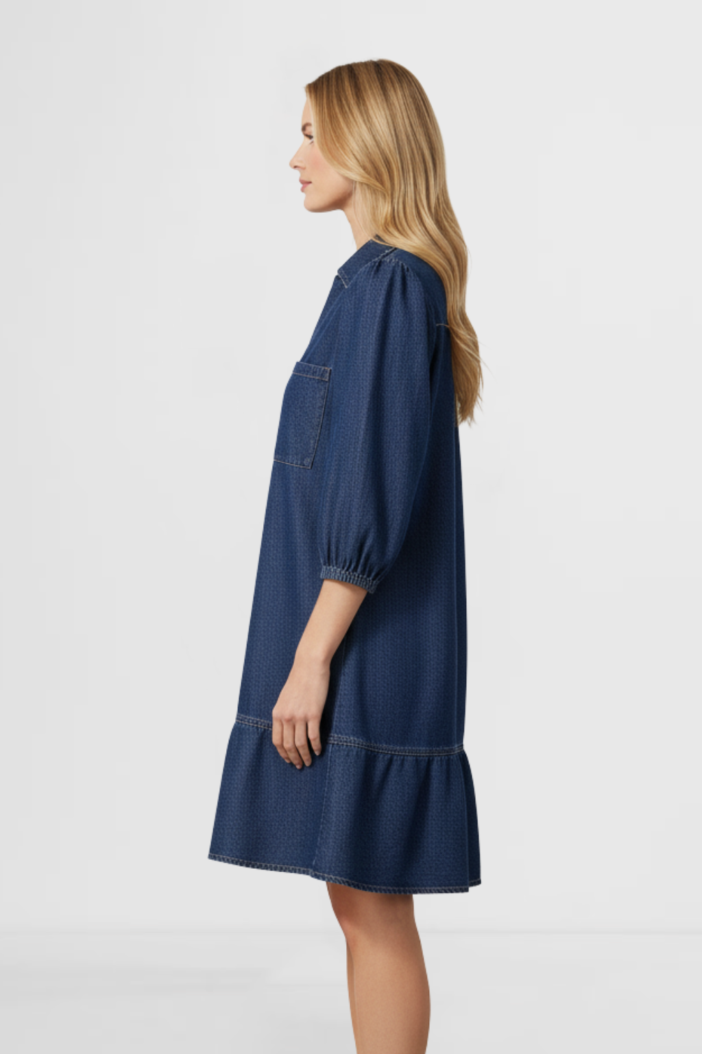 A sculpted V-neck and smocked sleeves meet fluid denim drape — relaxed, refined, and quietly confident.