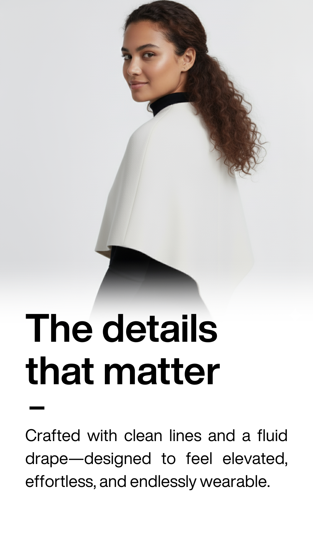 Minimalist silhouette with a fluid drape. Lightweight warmth, soft hand-feel, and endlessly versatile styling.