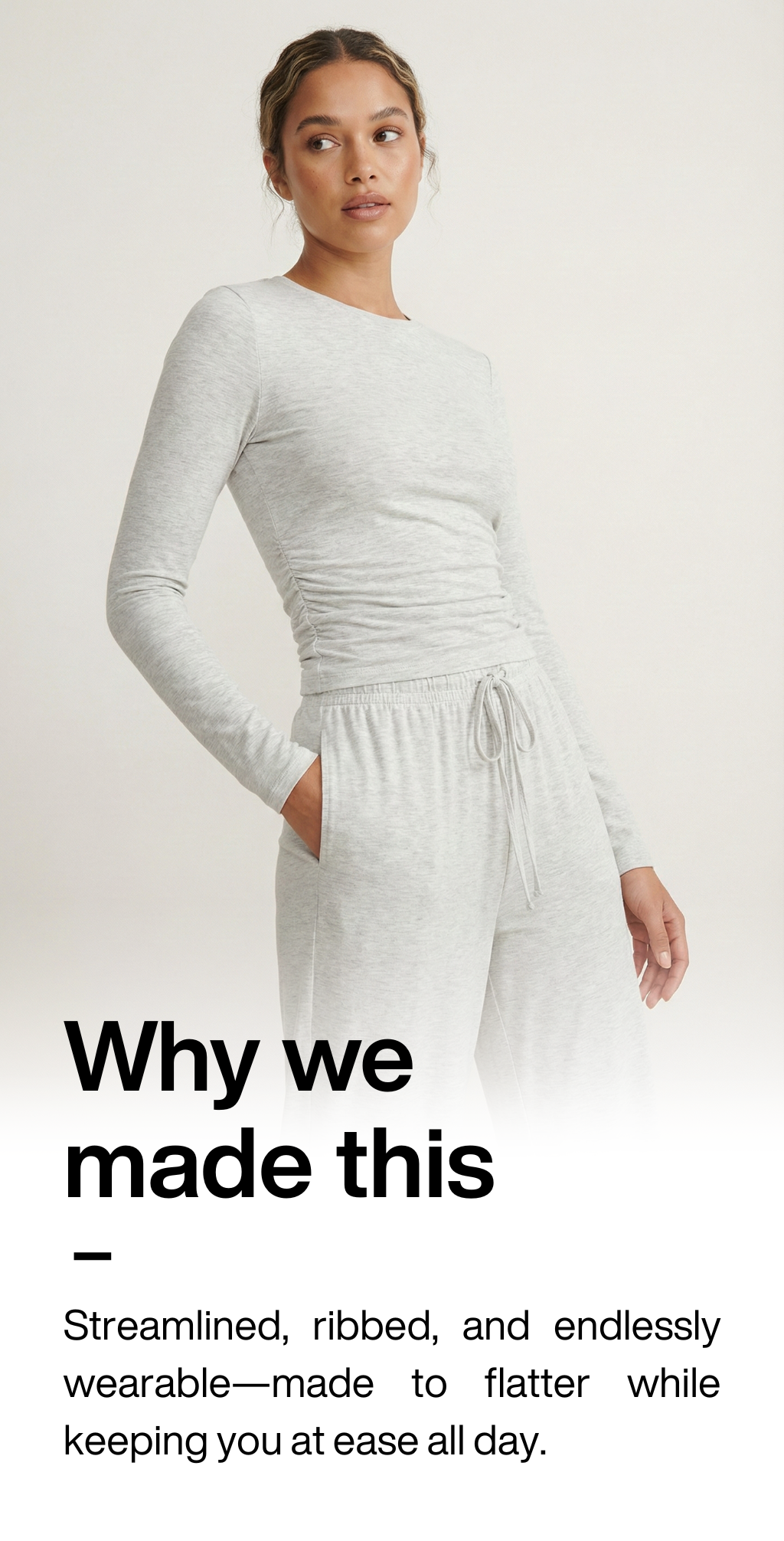 - Long-sleeve top with subtle side ruching for a flattering fit