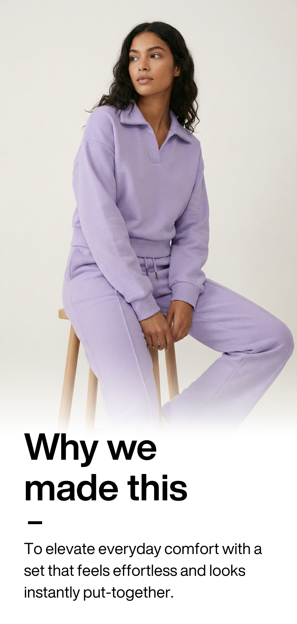 Hidden stretch waistband, relaxed raglan sleeves, and wide-leg pants designed for effortless movement and all-day ease.